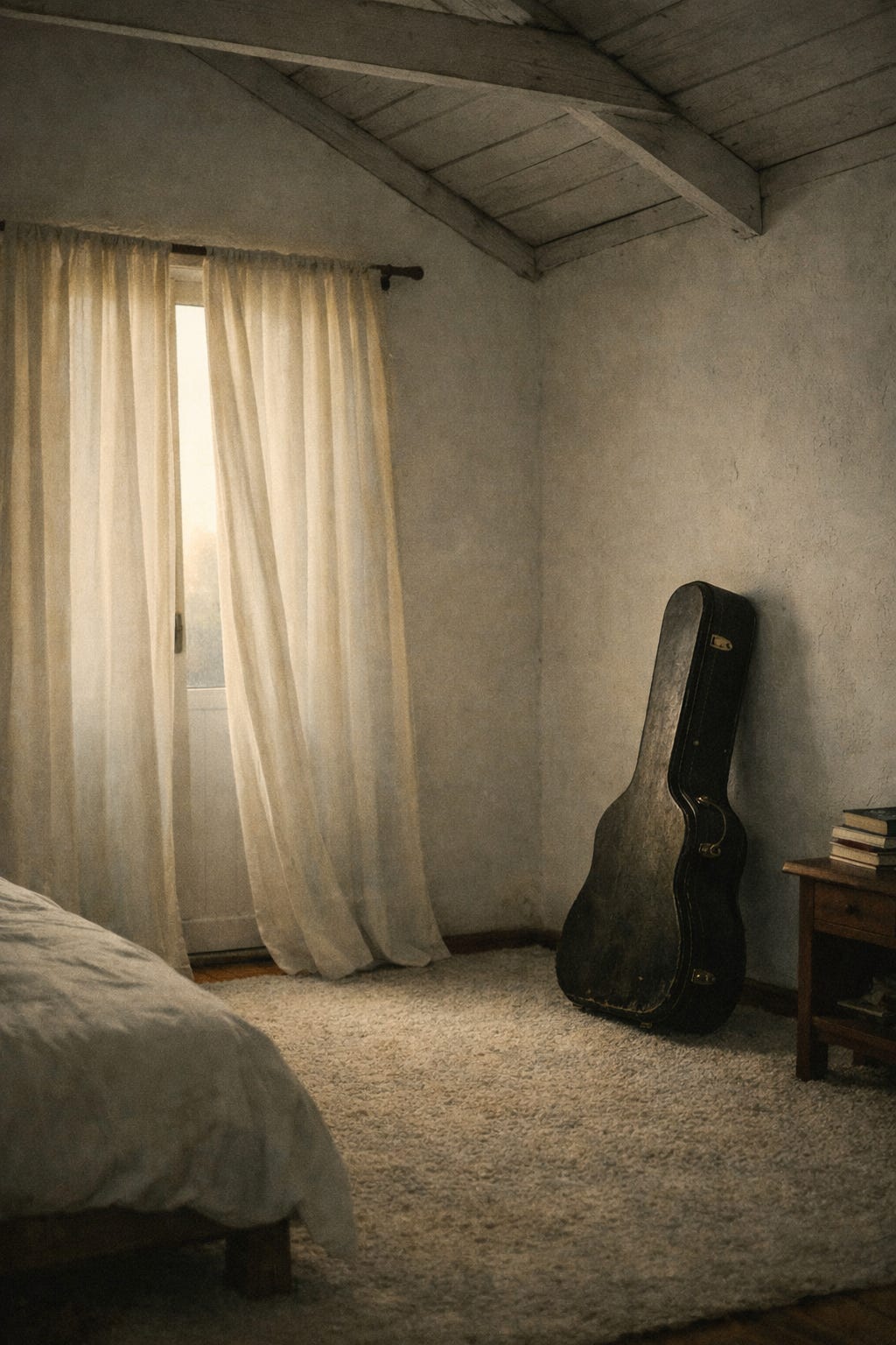 Opposite the bed, a black leathered guitar case rests dormant. Inside, a yellowwood Ibanez steel-string acoustic, copper strings weathered by years, the body bowed slightly at the sides. For nearly a decade it kept me sane: in a room this small, but large enough to discover no one else. Only myself.